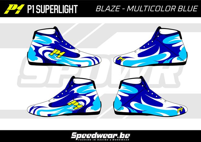 P1 CustomDesign Schoen BLAZE Blauw combineert topkwaliteit FIA 8856-2018 gehomologeerde raceschoenen met de creatieve kracht van het Speedwear design team. Kies uit een reeks vooraf ontworpen stijlen of ga voor een volledig gepersonaliseerd ontwerp dat perfect aansluit bij jouw teamkleuren, sponsorbranding of persoonlijke voorkeur.