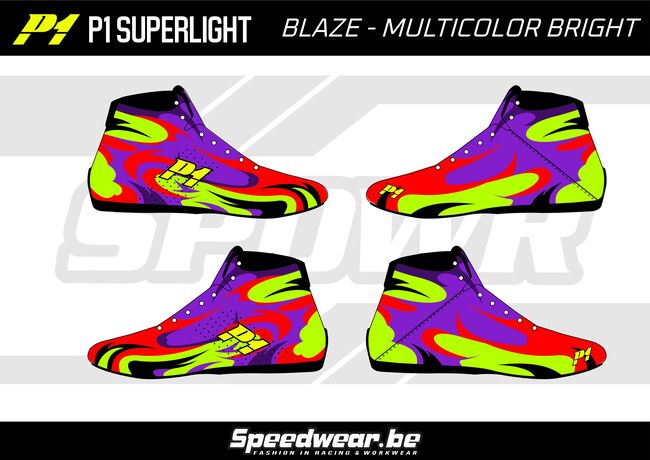 P1 CustomDesign Schoen BLAZE Paars combineert topkwaliteit FIA 8856-2018 gehomologeerde raceschoenen met de creatieve kracht van het Speedwear design team. Kies uit een reeks vooraf ontworpen stijlen of ga voor een volledig gepersonaliseerd ontwerp dat perfect aansluit bij jouw teamkleuren, sponsorbranding of persoonlijke voorkeur.