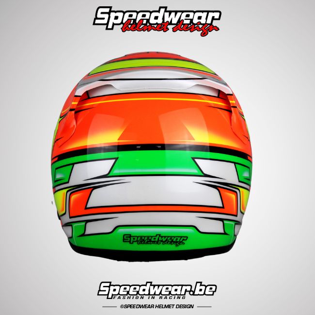 - Helmspuiting via vast patroon welke niet kan gewijzigd worden qua kleur of details. Enkel je naam + vlag kan hier toegevoegd worden. Indien je wijzigingen wil aanbrengen, dien je een supplement van 150 € extra te betalen.